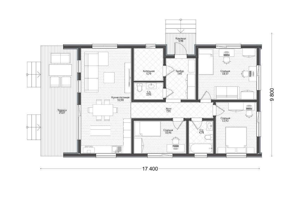 Представляем стильный одноэтажный дом с панорамными окнами, где граница между интерьером и природой становится почти незаметной. Просторная и функциональная планировка позволяет организовать пространство для жизни, работы и приёма гостей. Использование натуральных материалов подчёркивает экологичность и создаёт особую атмосферу уюта. Дом легко адаптируется к любому ландшафту. Он рассчитан на комфортное проживание в любое время года. Это ваш личный уголок для гармонии и вдохновения.