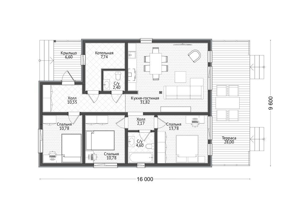 Двухэтажный дом в финском стиле имеет красивый симметричный фасад и панорамное остекление гостиной на первом этаже. Планировка дома довольно удобная и современная. Кухня на первом этаже объединена со столовой с отдельным выходом на террасу, также на первом этаже расположена вместительная гостиная, санузел, котельная, спальня и кабинет. Наверху есть 2 небольшие спальни и 1 мастер – спальня с отдельным санузлом. Возможно исполнение планировки без второго света.
