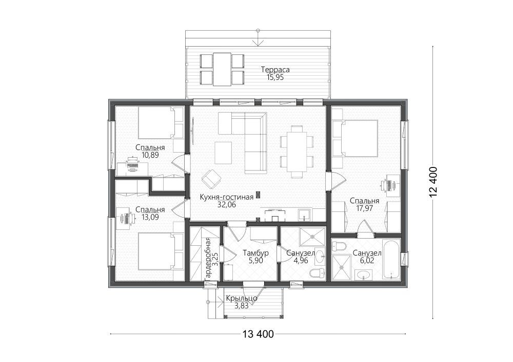 Двухэтажный дом в финском стиле имеет красивый симметричный фасад и панорамное остекление гостиной на первом этаже. Планировка дома довольно удобная и современная. Кухня на первом этаже объединена со столовой с отдельным выходом на террасу, также на первом этаже расположена вместительная гостиная, санузел, котельная, спальня и кабинет. Наверху есть 2 небольшие спальни и 1 мастер – спальня с отдельным санузлом. Возможно исполнение планировки без второго света.